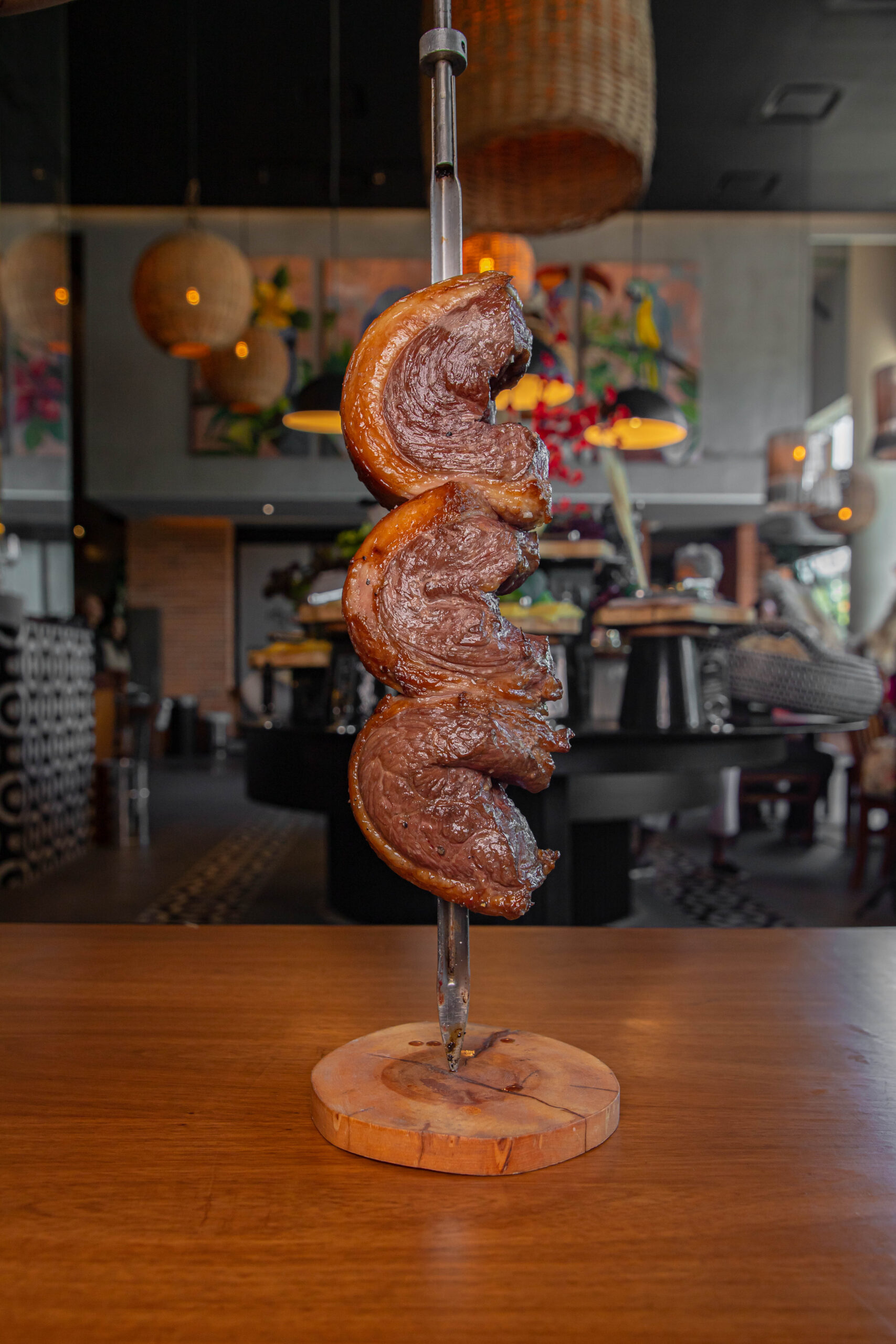 Aquí lo principal que puedes esperar son cortes de carne en el estilo churrascaría brasileña, donde los cortes vienen al plato uno a uno desde la parrilla, y hay cortes como Picanha, Costillas, Lomo y Alcatra junto con más del Brasil servidos en espadas por el personal, así que es distinto a tú eliges tu plato, porque es un servicio continuo de carnes asadas al paso por tu mesa.