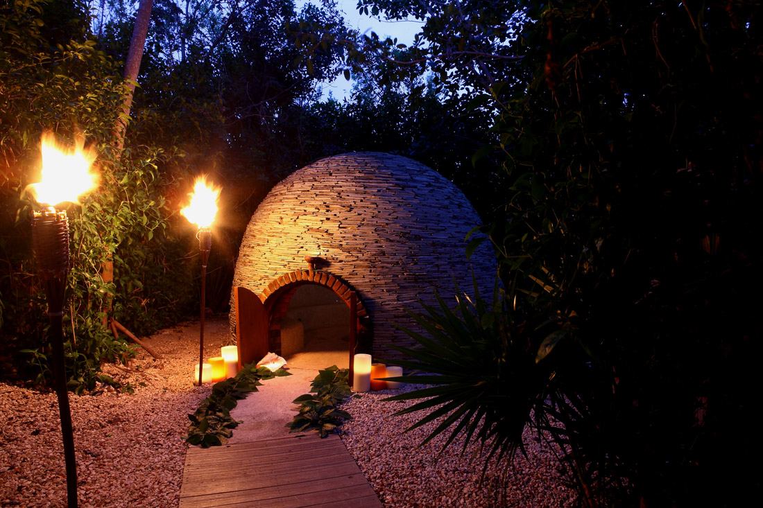 Otro hotel con este atractivo es Maroma, A Belmond Hotel, y en él, un shamán maya comienza el ritual tocando una concha y orando a cada punto cardinal, pidiendo al universo permiso para empezar, entonces él limpia su energía con copal antes de que entres al domo caliente.