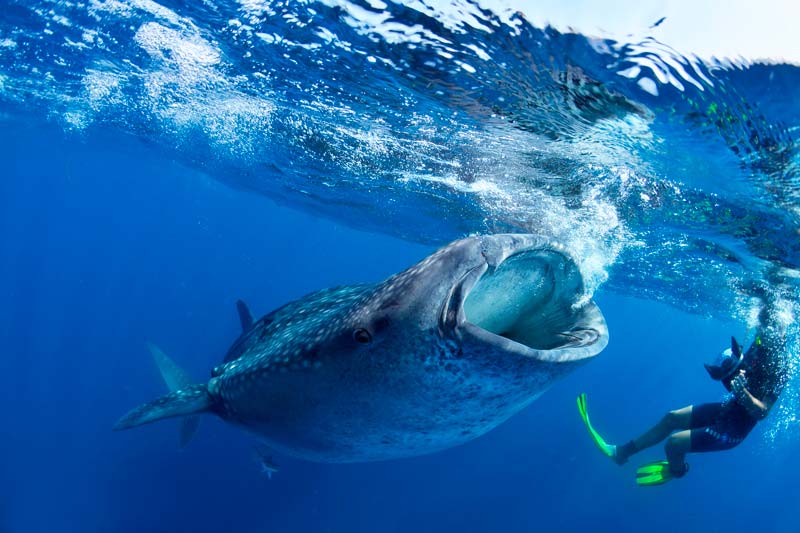 Los tiburones ballena son los peces más grandes del mundo, gigantes marinos inofensivos que viven en aguas cálidas y tropicales que se alimentan por filtración de plancton y peces pequeños, también expulsan agua por medio de sus branquias y manchas blancas sobre un fondo gris que identifican a cada uno. Además, son majestuoso al medir entre 12 y 18 metros de largo.